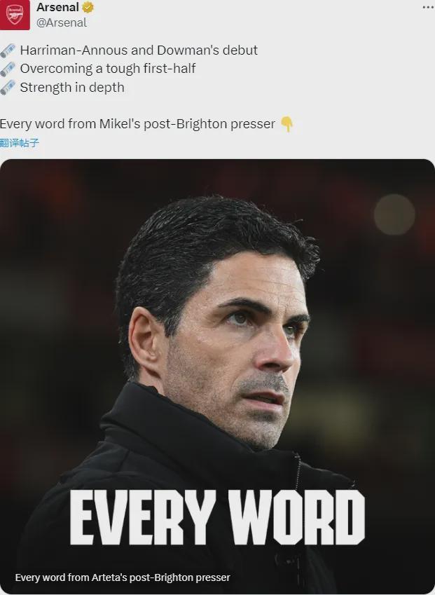 另外这也要夸夸阿尔特塔,本来以为本场比赛至少会有几名主力首发,但塔子干脆彻底,只保留了埃泽,其他首发全部轮换,道曼和安努斯更是得到了首发机会!