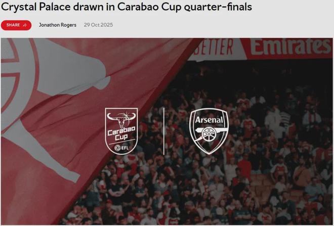 官方:阿森纳将在联赛杯四分之一决赛中主场对阵水晶宫,比赛将在12月15日开始的一周里进行,具体时间待定。
